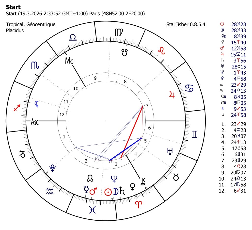 La Nouvelle Lune du 19 mars en Poissons, qui se produit moins de deux jours, ou 1°30 avant l’arrivée du Soleil en Bélier, se fait avec la conjonction à Neptune à 1°43 en Bélier et annonce la conjonction à Saturne à quasi 4°. La conjonction exacte Neptune-Saturne directe s’est déjà produite à 1° en Bélier, le 15 février, moment de la pleine lune