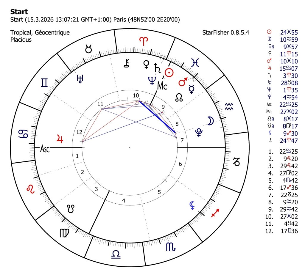 Au premier tour, l’amas Nœud nord, Mercure, Mars, Soleil se situe en Poissons, conjoint à Saturne 3°30, Neptune 1°35, Vénus 11°15, plus loin Chiron, indiquant encore une certaine hésitation, tolérance, cependant la lune en conjonction à Pluton et sextile, aux planètes en Bélier, appelera le dégagisme devant l’absence d’action, notamment au niveau des problémes des familles, puisque Jupiter en Cancer, sur le thème, ici pour Paris, se mettra en quasi opposition à Pluton.